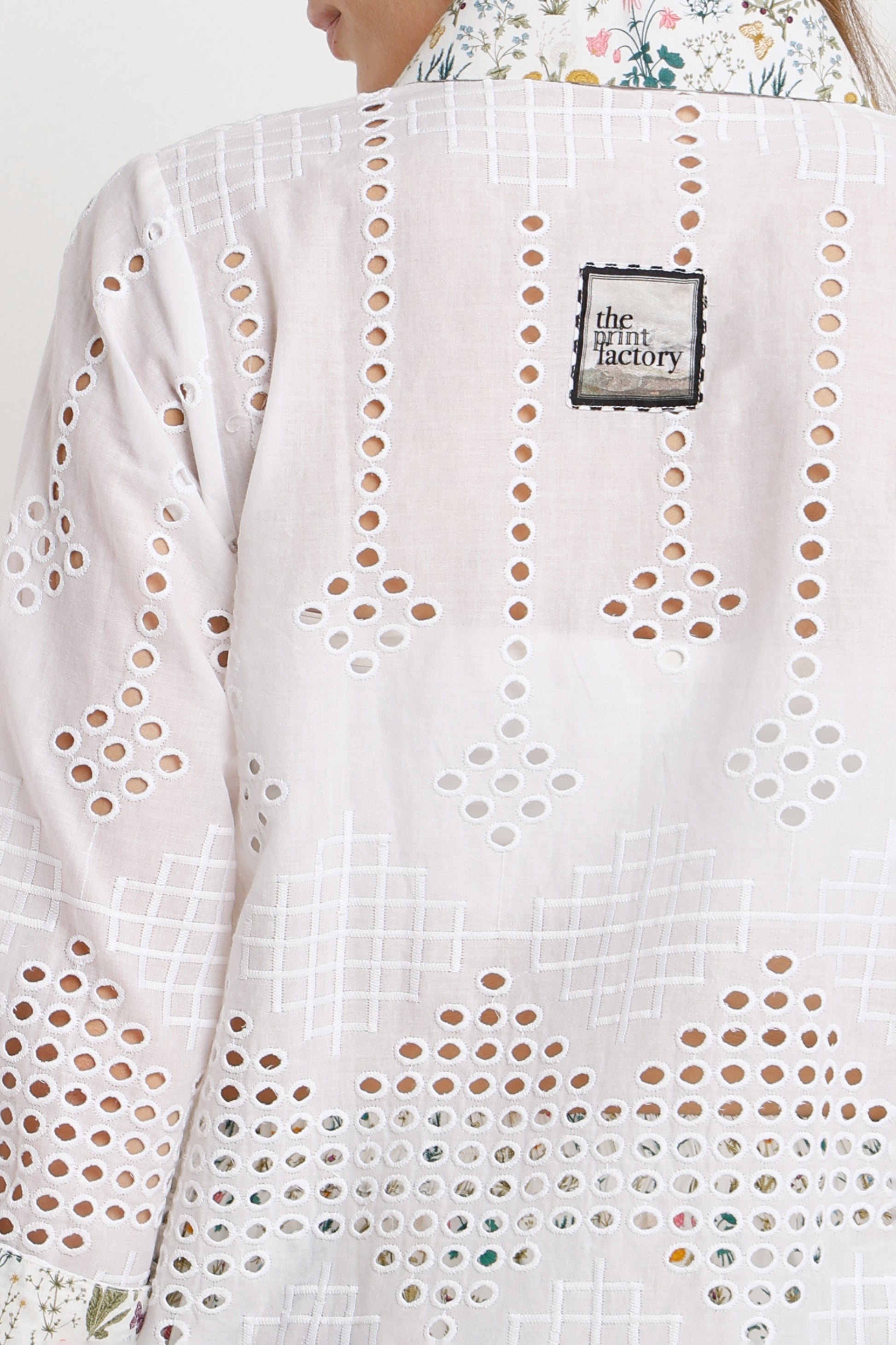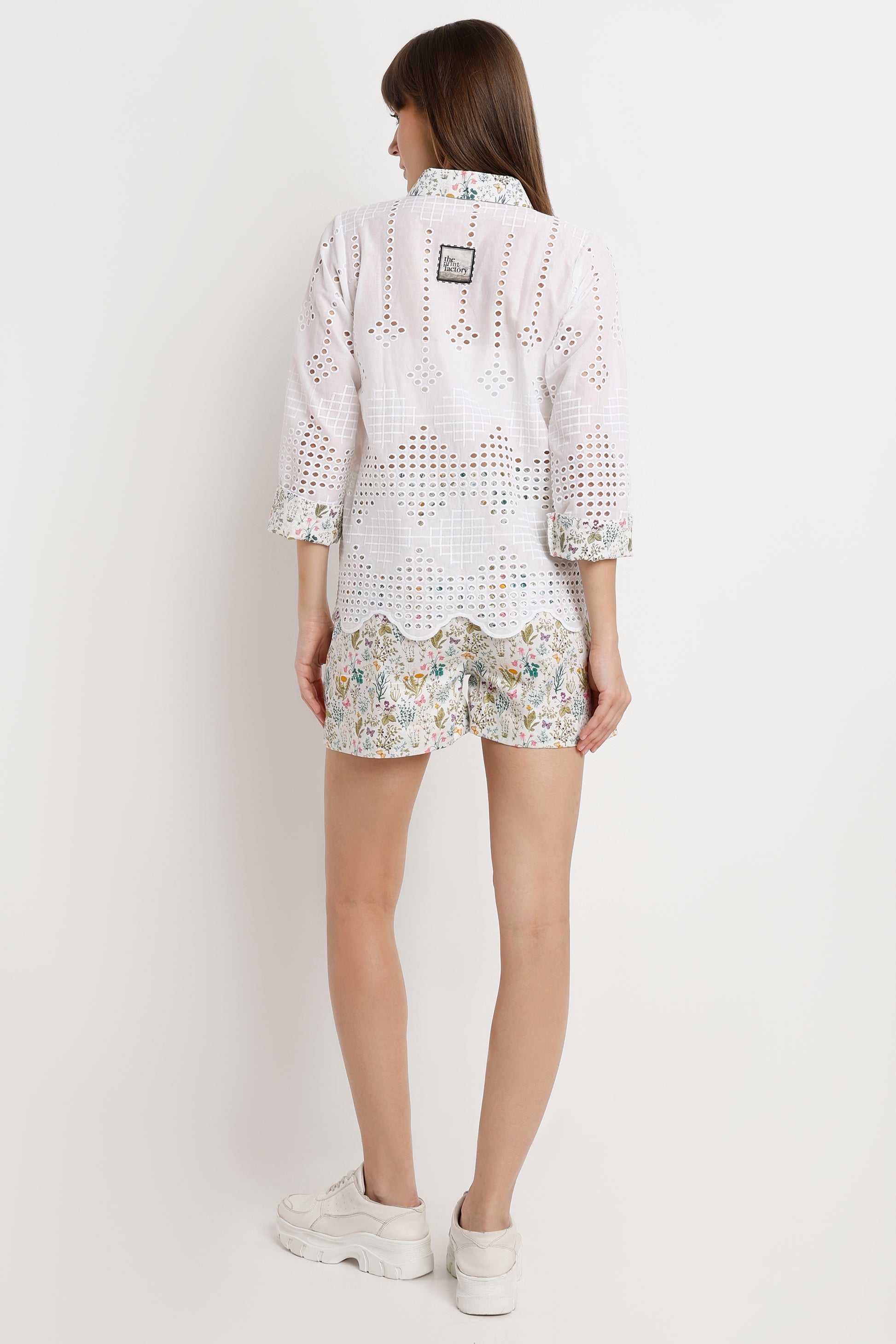 This Garden Laceband Shirt with Shorts Set combines elegance and comfort using premium materials. The shirt features intricate Schiffli embroidery crafted from 100% organic cotton, ensuring breathability and softness. Paired with shorts made from 100% organic cotton satin, the set offers a smooth, luxurious feel ideal for warm weather. Perfect for those seeking sustainable fashion without compromising on style or quality.