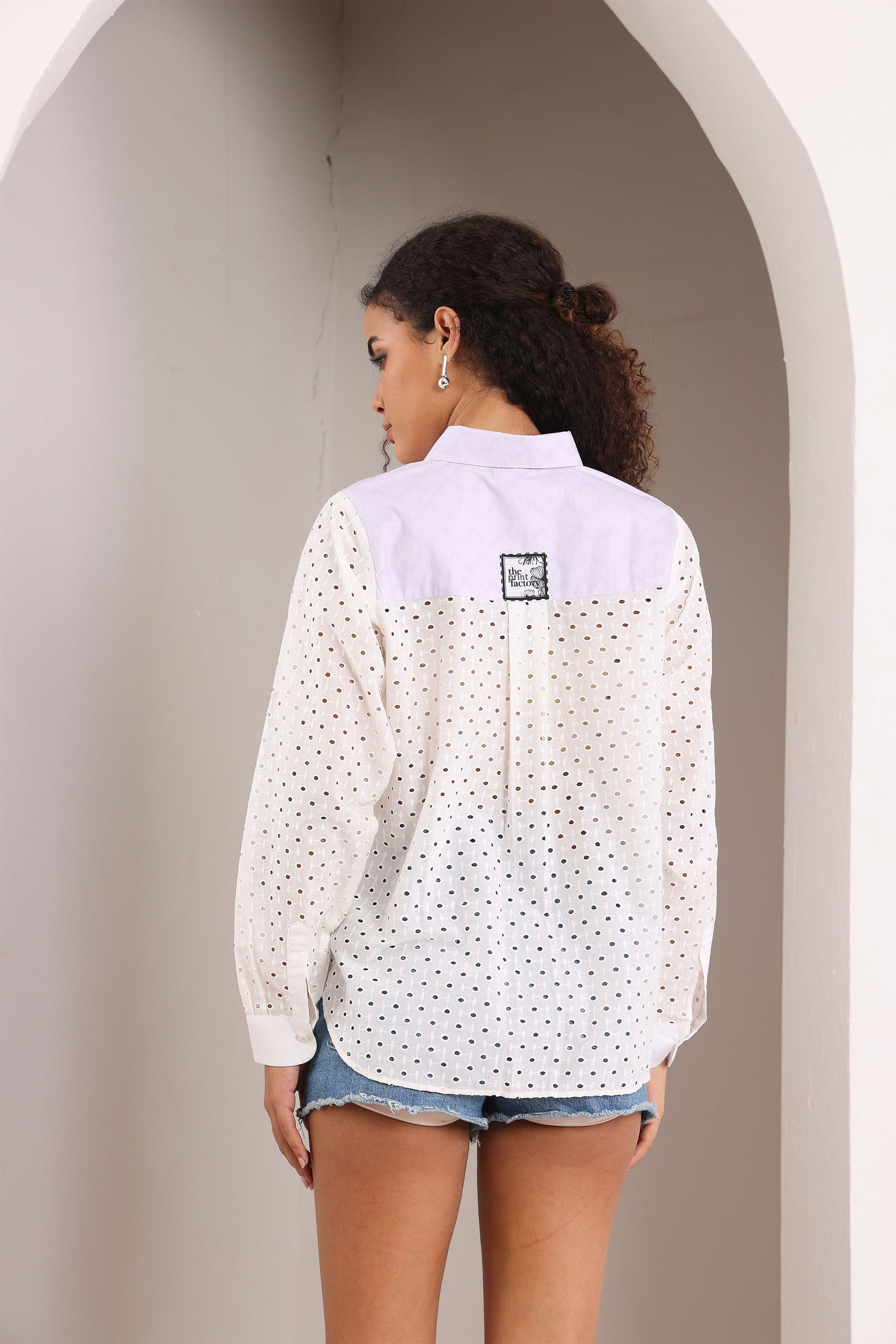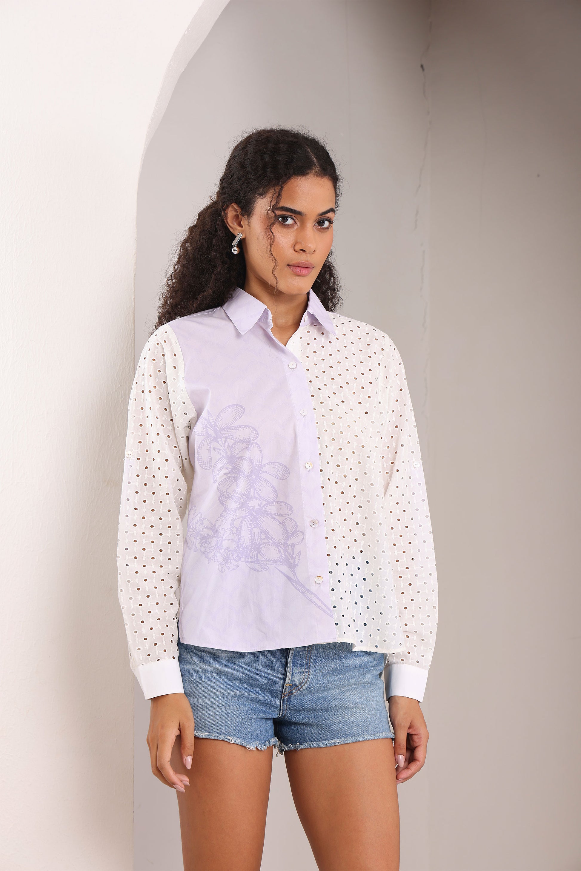 Crafted from 100% organic cotton with intricate Schiffli embroidery, the Lavender Drift Shirt offers a refined regular fit that balances comfort and style. Its breathable fabric ensures all-day wearability, while the detailed craftsmanship adds a sophisticated touch, making it an ideal choice for those seeking sustainable elegance in their wardrobe.
