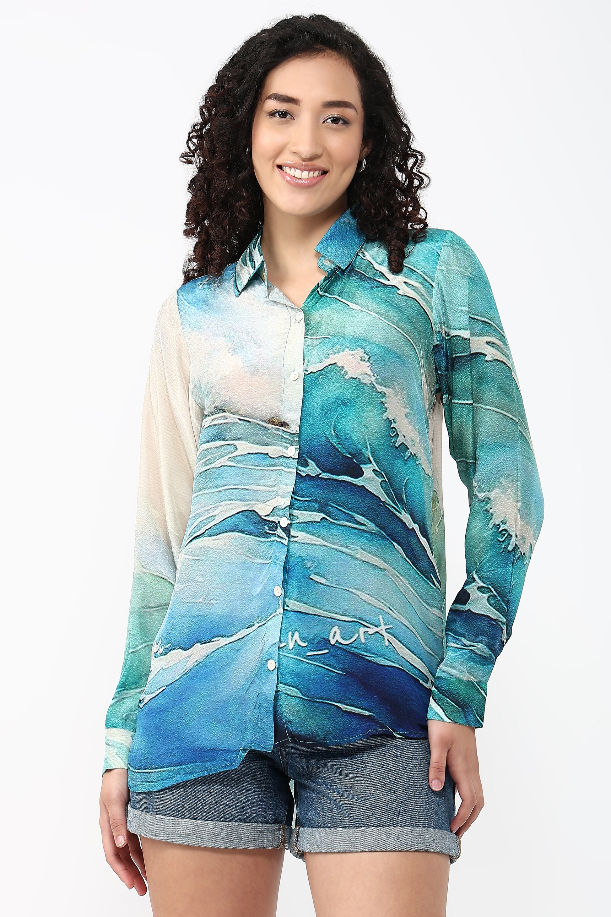 The Ocean Tangle Shirt features a regular-fit design crafted from 100% natural crepe. With its soft, breathable texture, this shirt ensures all-day comfort while maintaining a refined silhouette. Inspired by oceanic hues, it blends flowing shades of teal and sapphire with painterly foliage and abstract textures. Cool and contemporary, this versatile piece adds a refreshing touch of style, perfect for warm weather and relaxed occasions.