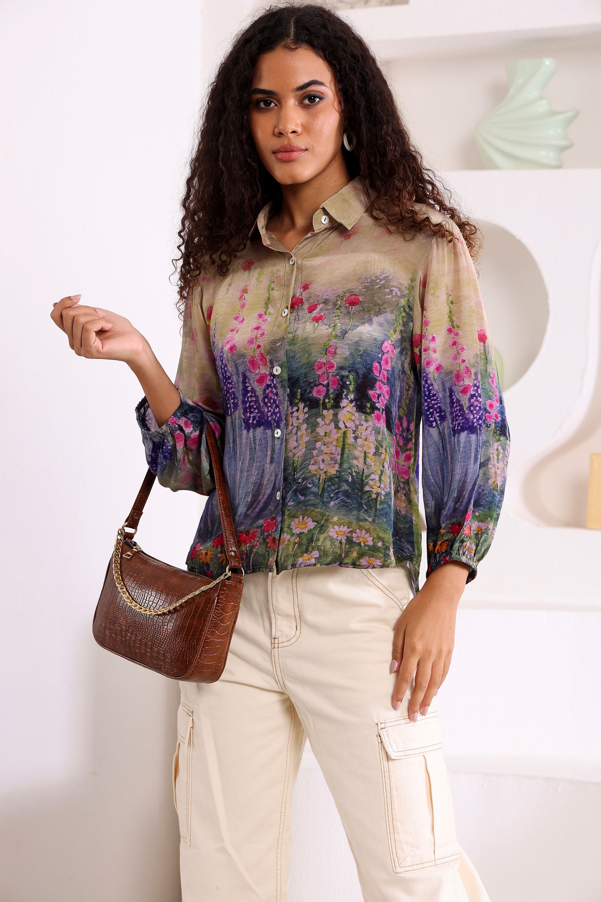 Crafted from 100% natural crepe fabric, the Pastel Forest Shirt offers a refined texture and breathable comfort ideal for all-day wear. Its regular fit ensures a balanced silhouette that suits various body types, combining elegance with ease. Perfect for those seeking a sophisticated yet comfortable wardrobe staple.