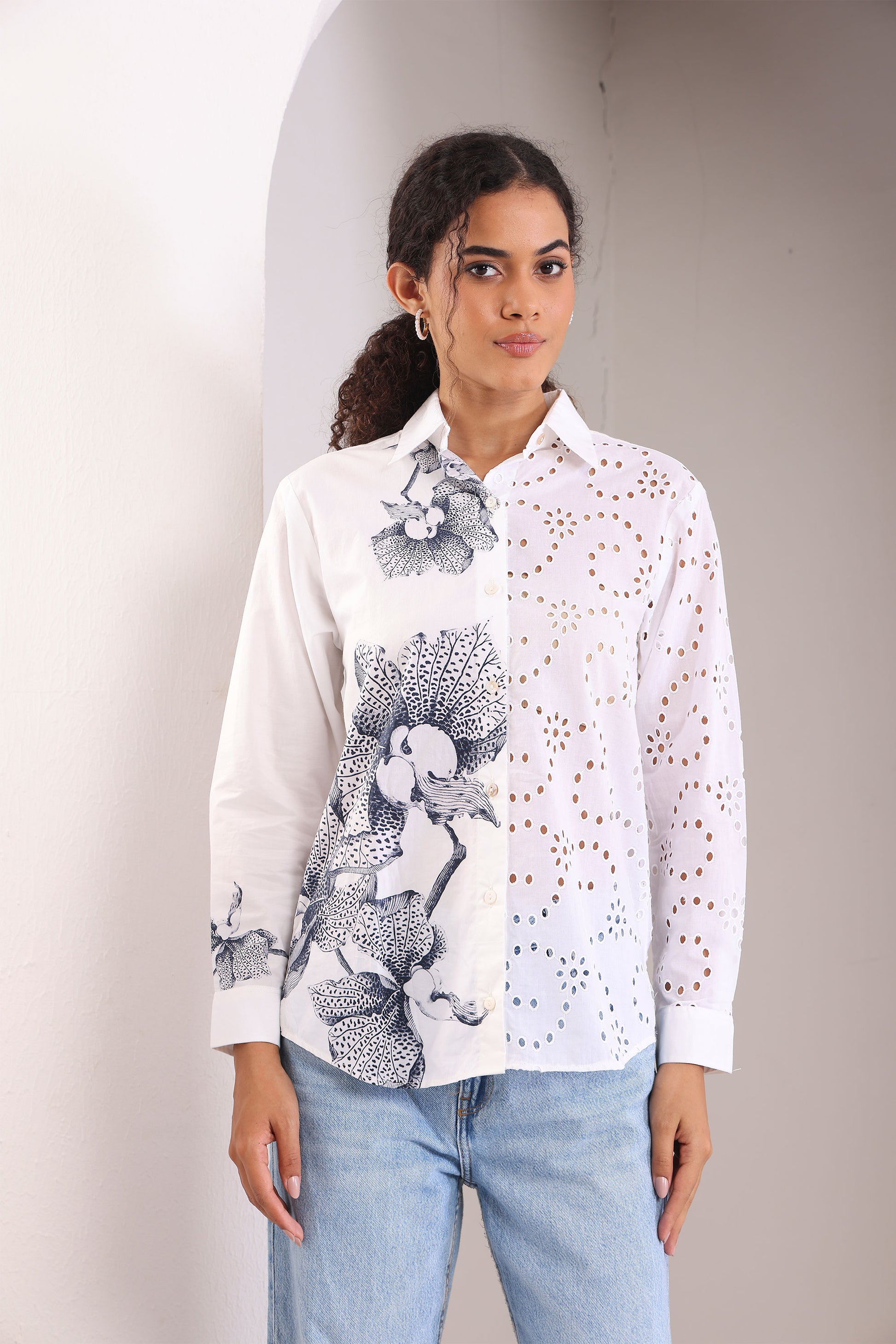 Crafted from 100% organic cotton with intricate Schiffli embroidery, the Shadow Petals Shirt offers a refined regular fit that balances comfort and style. Its breathable fabric ensures all-day wearability, while the detailed embroidery adds a sophisticated touch, making it an ideal choice for those seeking sustainable elegance in their wardrobe.