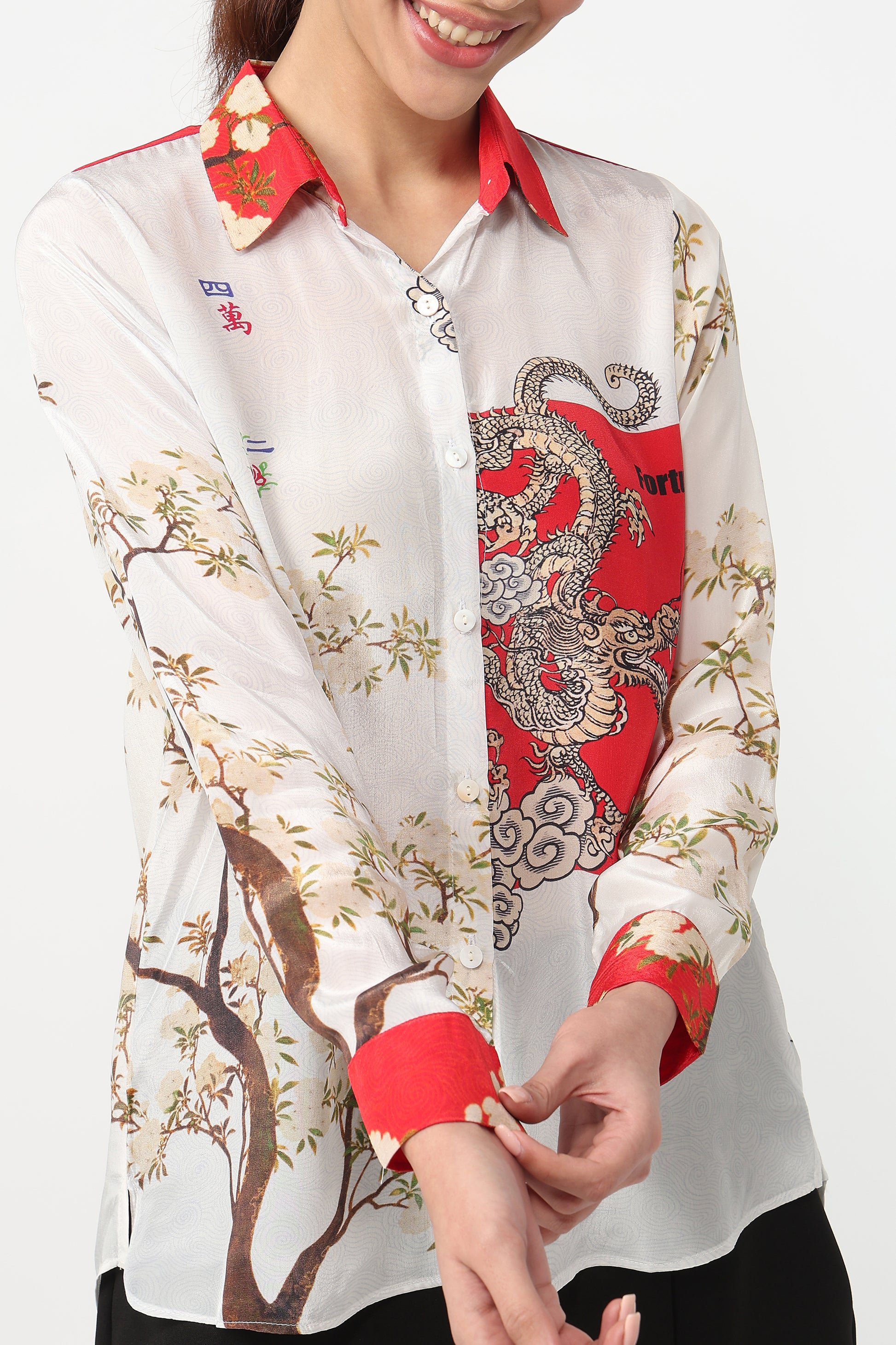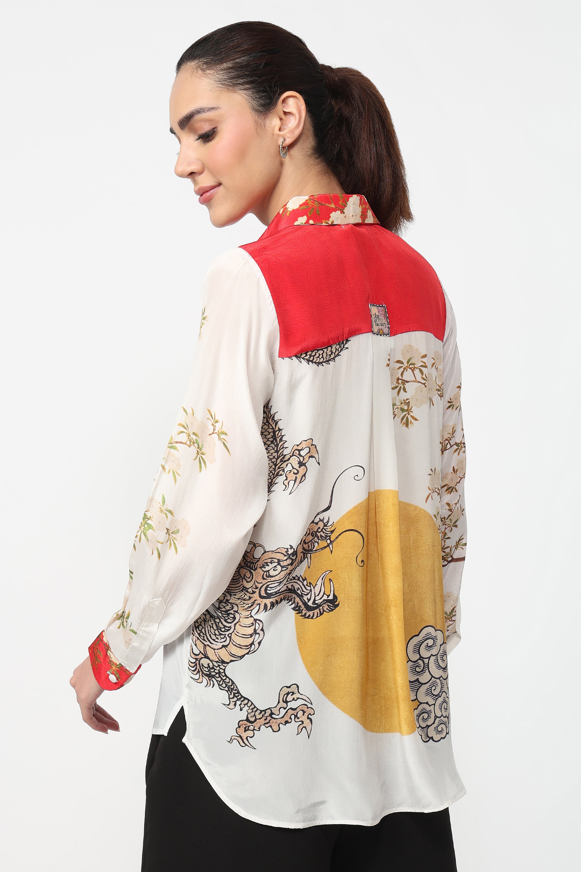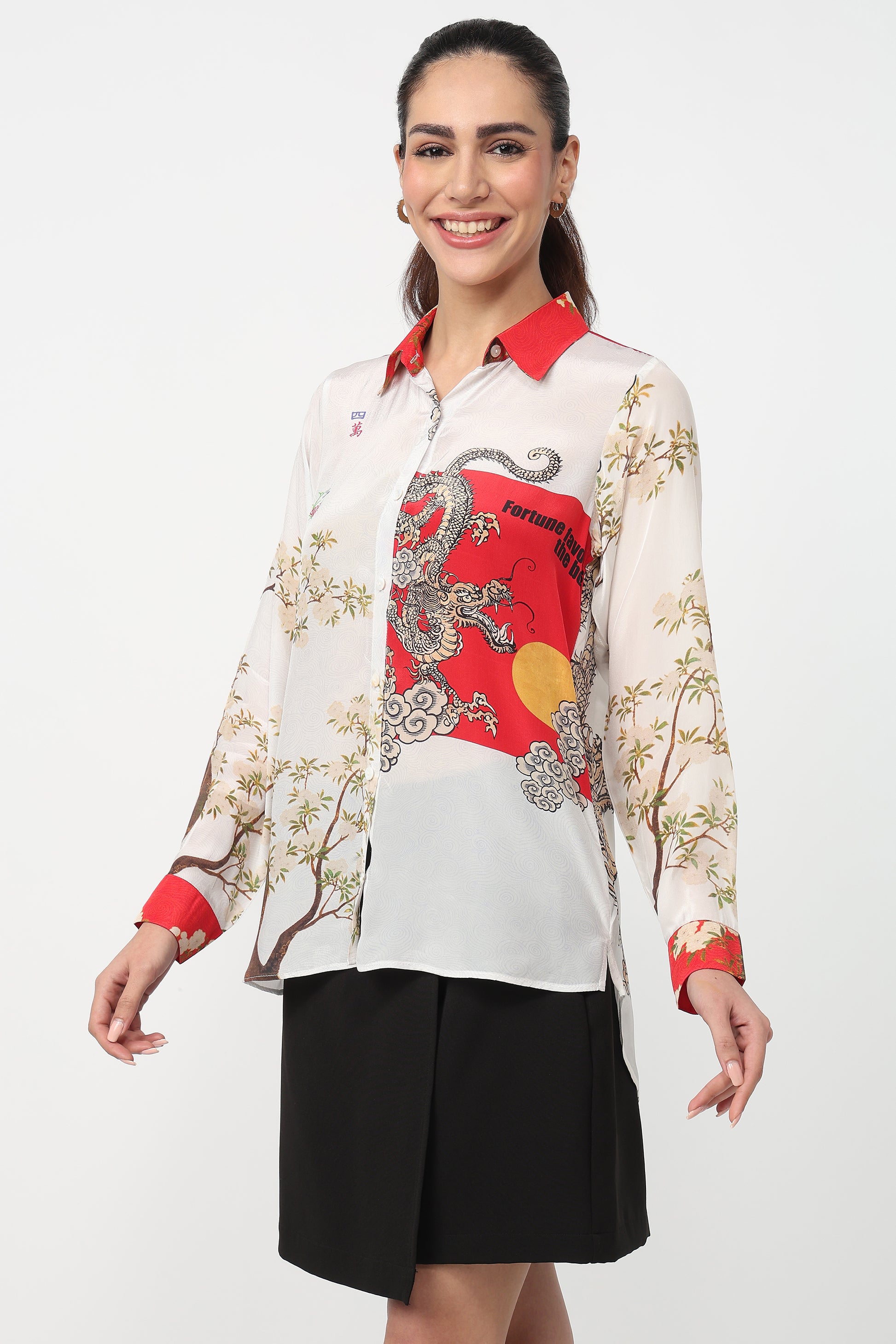 collar, contrast red accents, and a majestic dragon motif set against serene floral illustrations — it’s designed for those who appreciate detail and distinction. Soft, breathable, and effortlessly elegant, this shirt is a true statement of luxury craftsmanship.