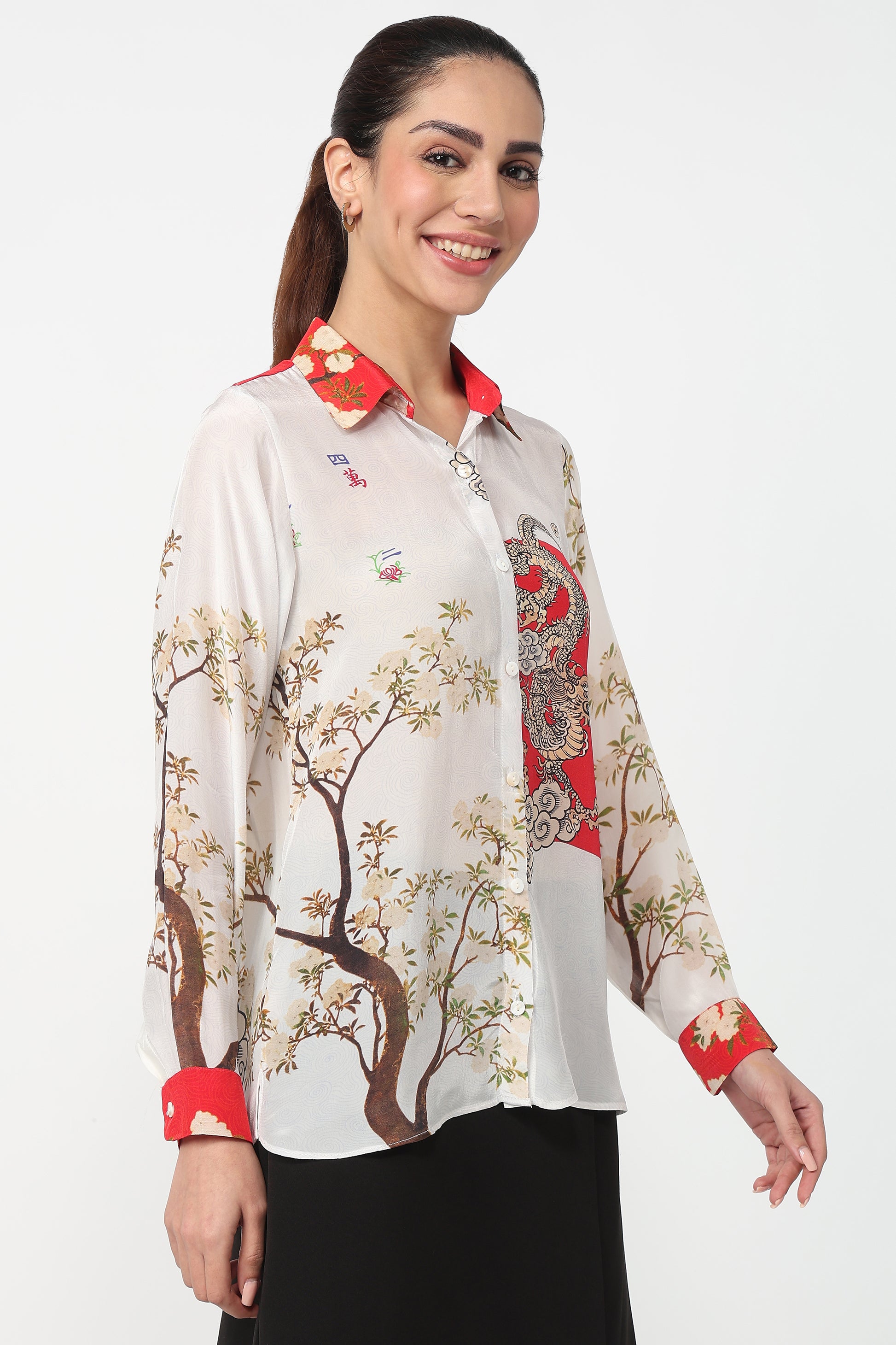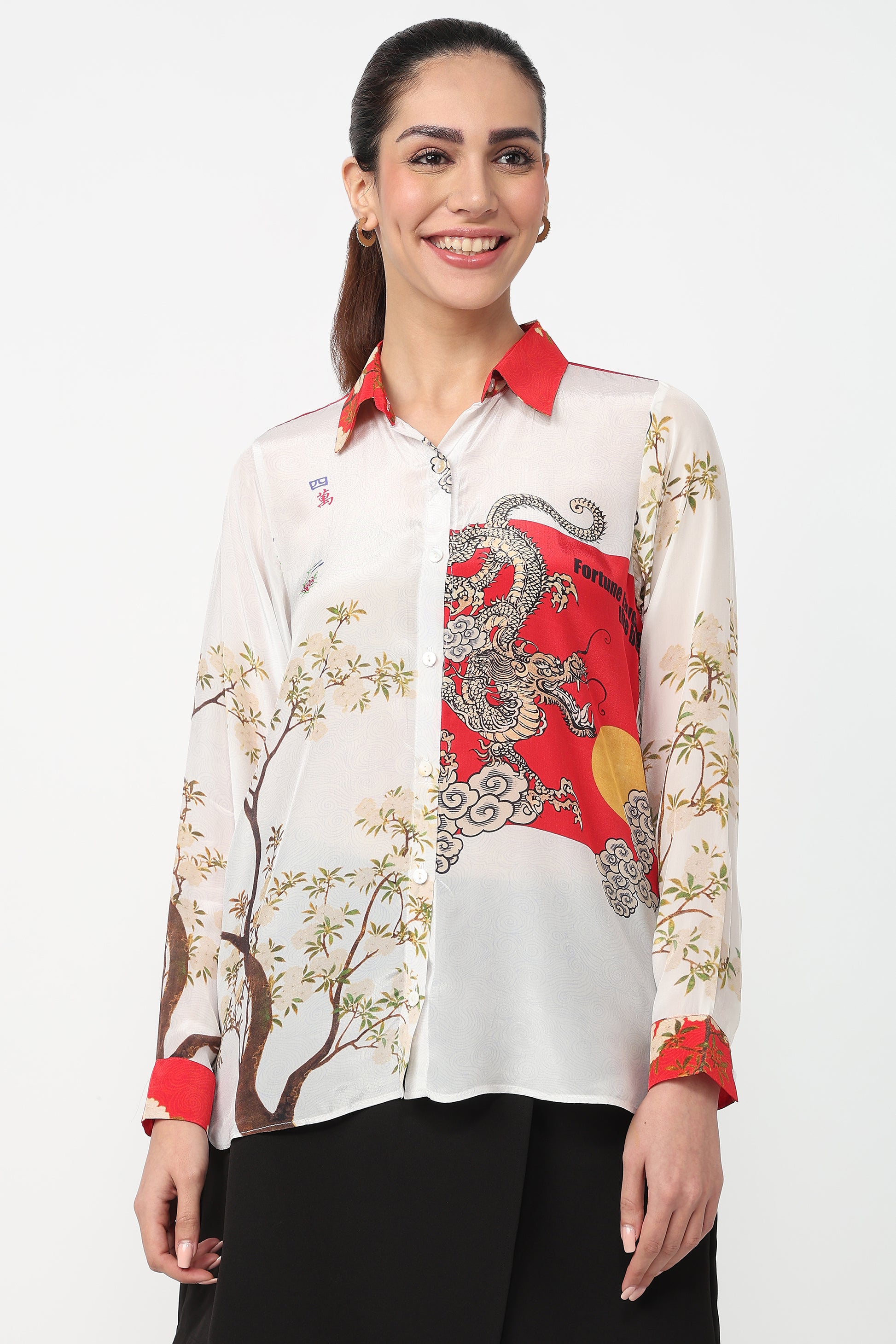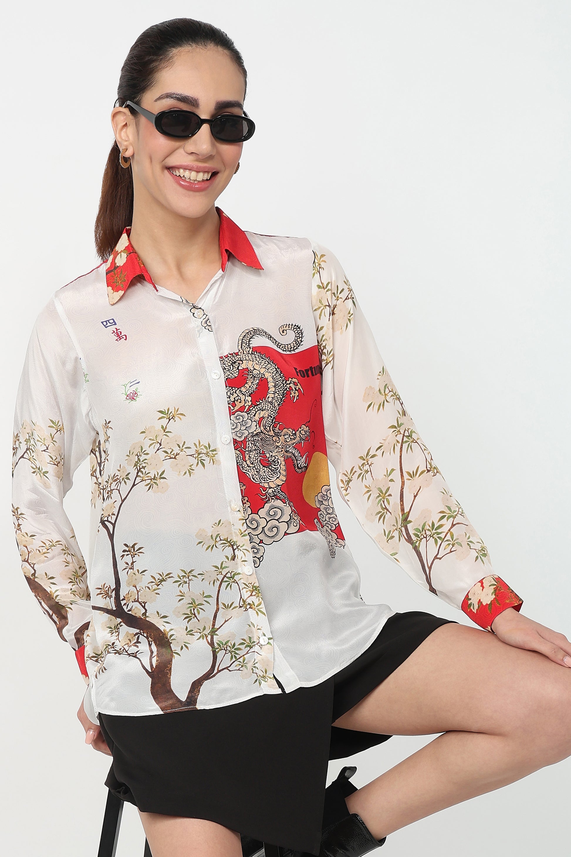 collar, contrast red accents, and a majestic dragon motif set against serene floral illustrations — it’s designed for those who appreciate detail and distinction. Soft, breathable, and effortlessly elegant, this shirt is a true statement of luxury craftsmanship.